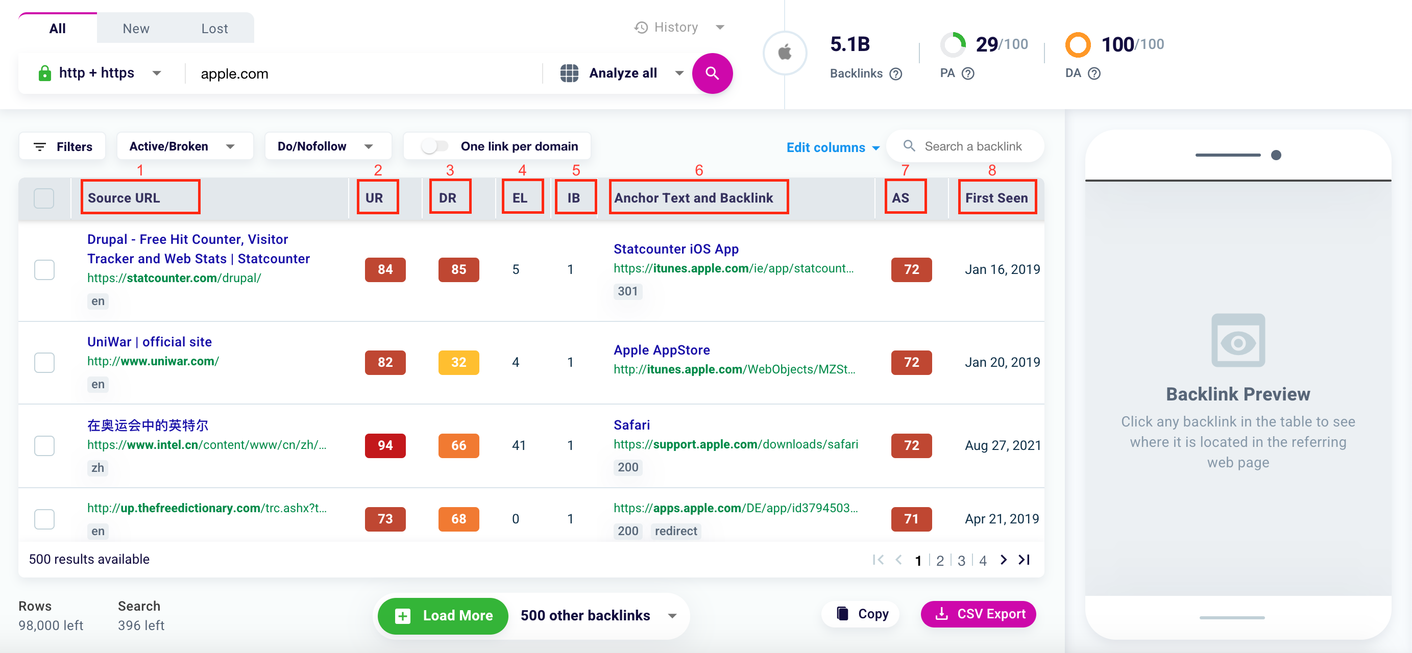 In Anchor Text and Backlink (6) you can see the anchor text of a link and the URL of the linked page. In this section, you will also find some labels to better understand the value and health status of the page that received the backlink.