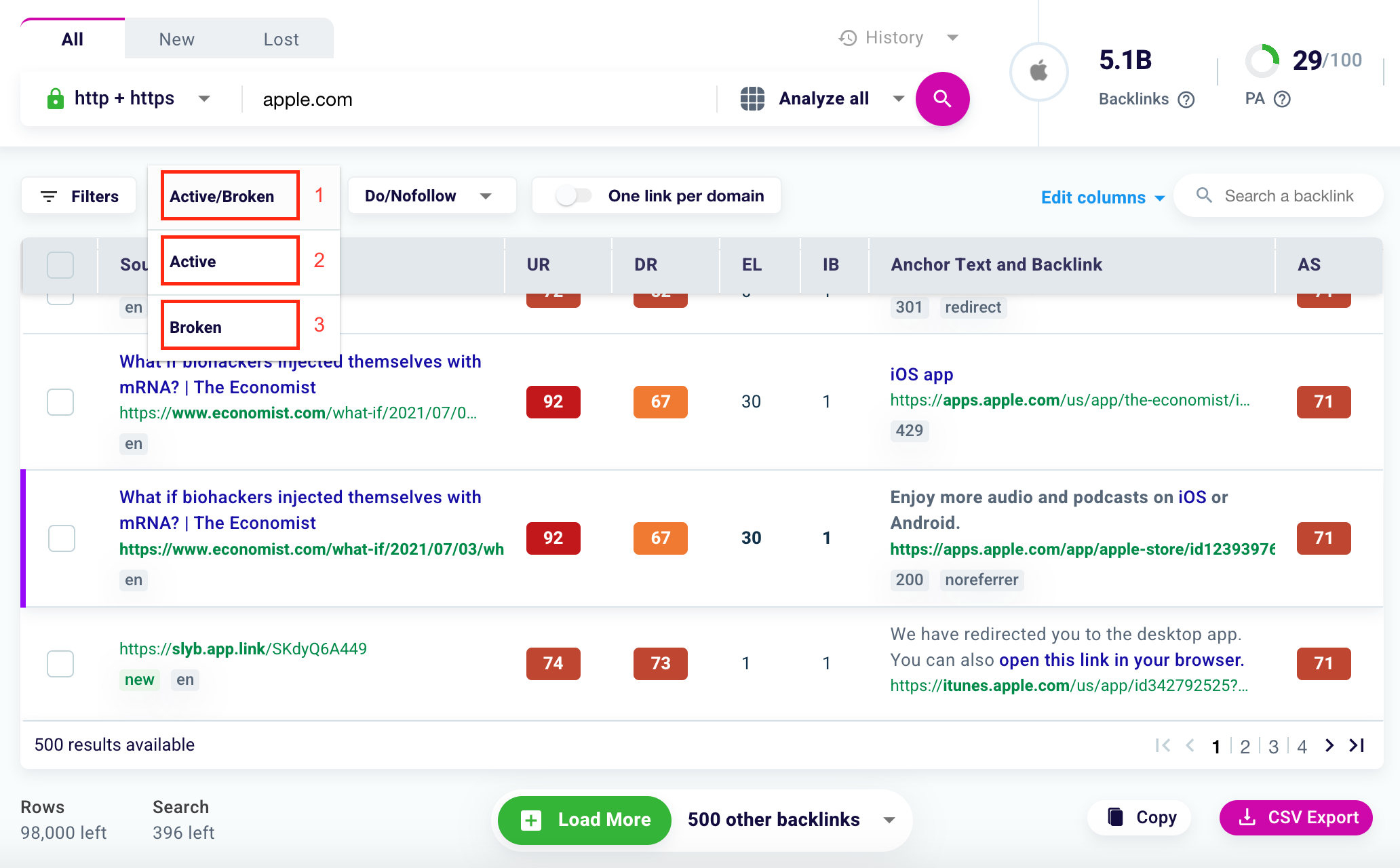 Filter the results for only active backlinks (2) or only broken backlinks (3), or for both (1). The latter is the default setting entered by our software.