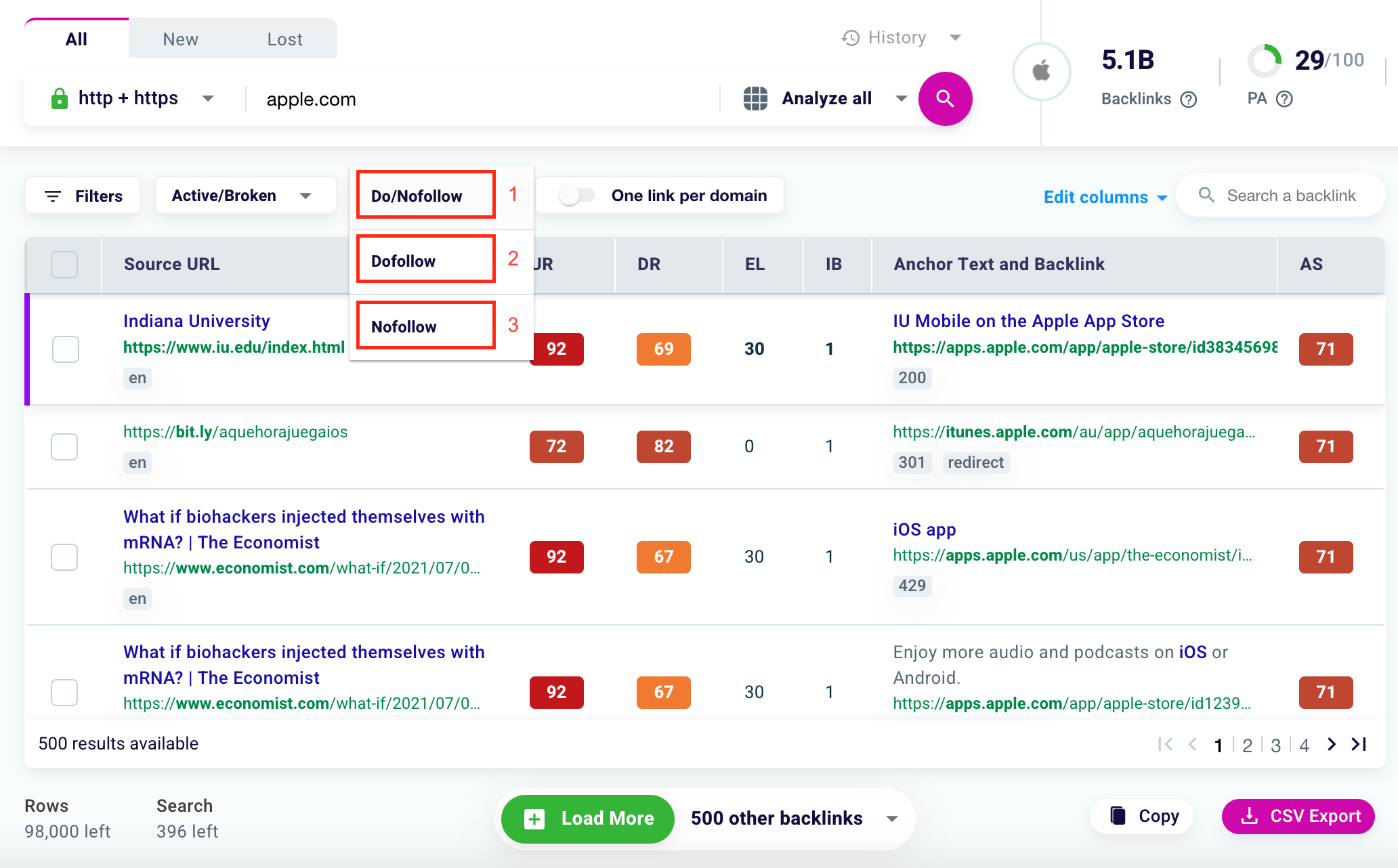 Filter the results for Dofollow links only (2) or Nofollow links only (3), or for both (4).