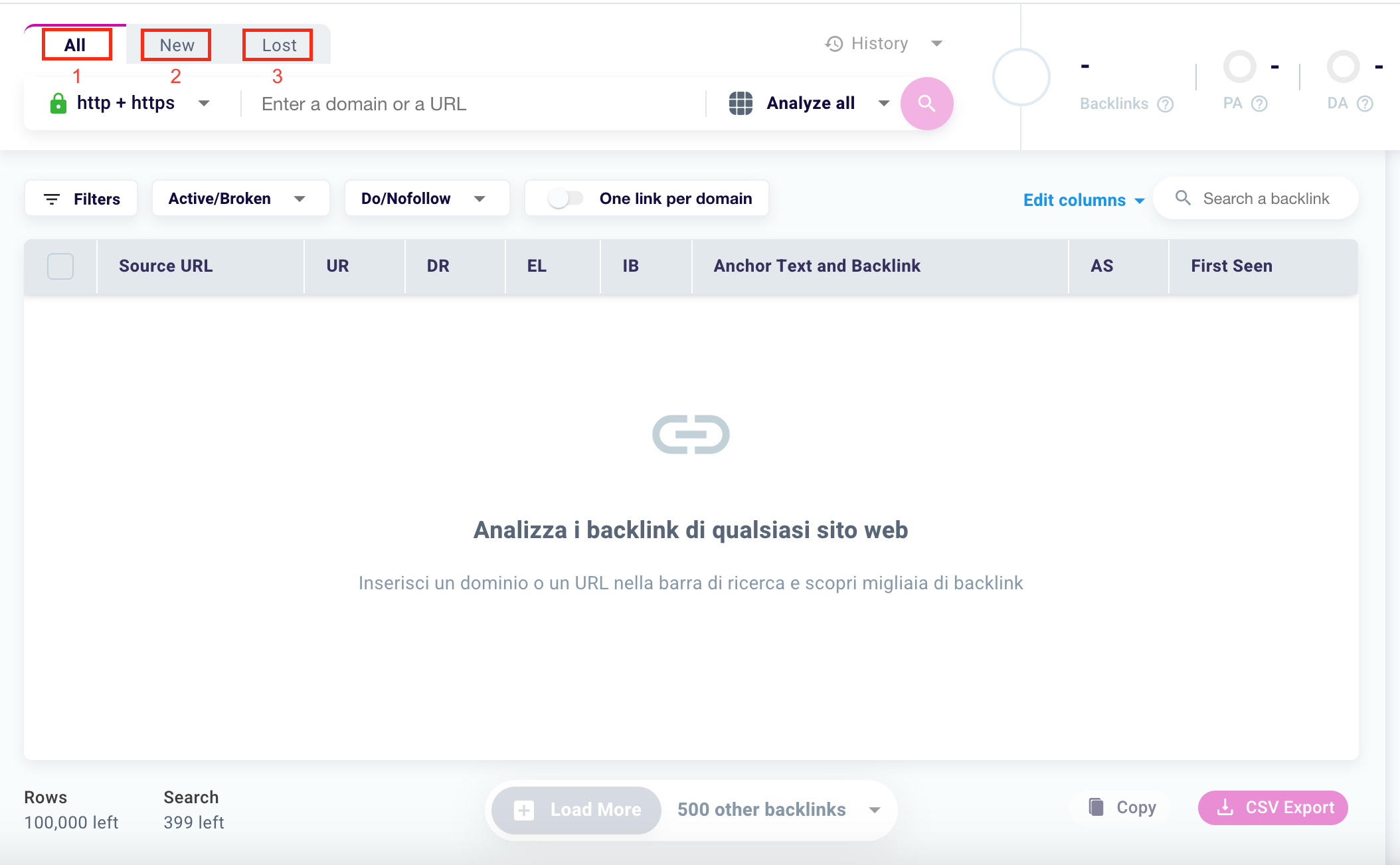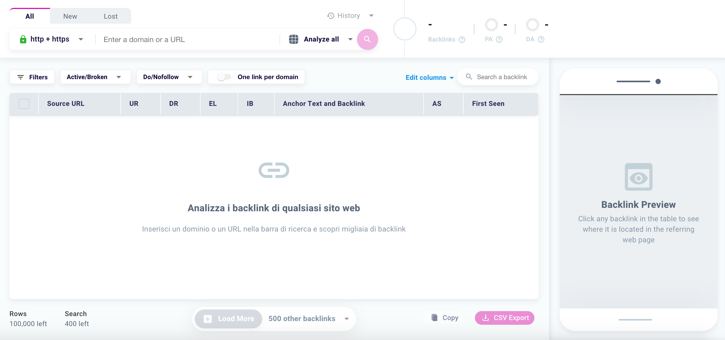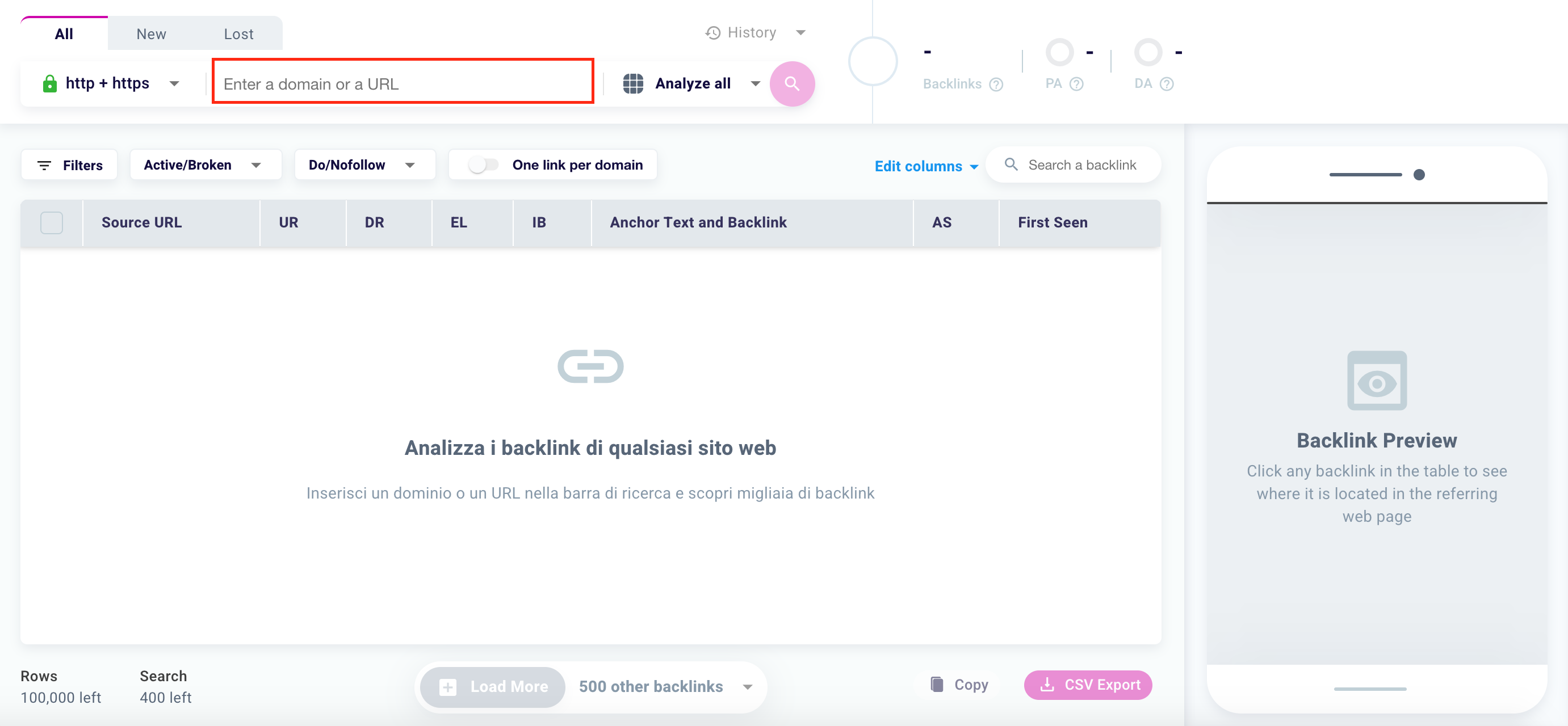 If you are analyzing a small or recently created site with few backlinks, the gray button may appear. This means that our software has already downloaded all the backlinks of the domain or the analyzed URL, and it is not possible to add others.