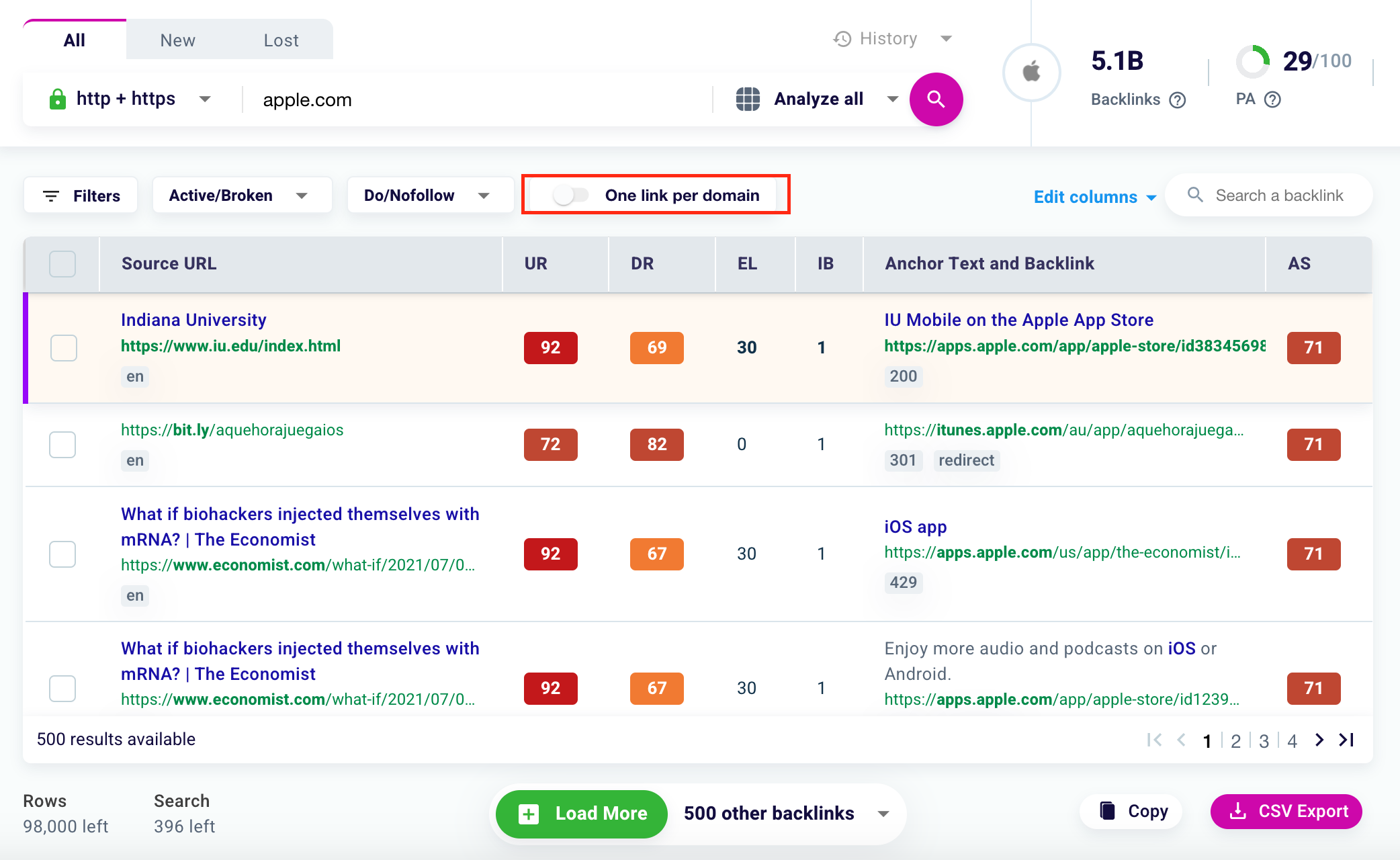 Each domain can direct multiple times to the analyzed domain or URL. Select the toggle to the left of the word “One link per domain” to limit the search to one link per domain.
