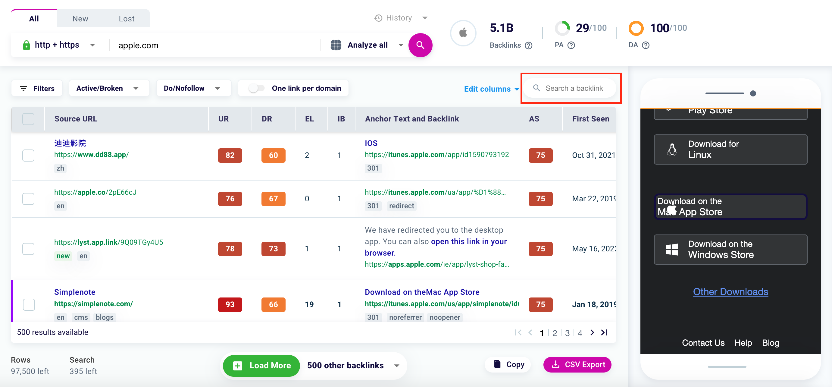 Are you looking for a specific backlink? Use the search bar highlighted on the screen to find it. Write a keyword or a linked domain to find what you are looking for.