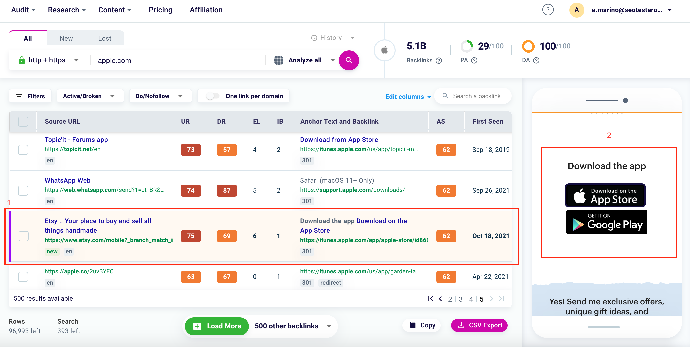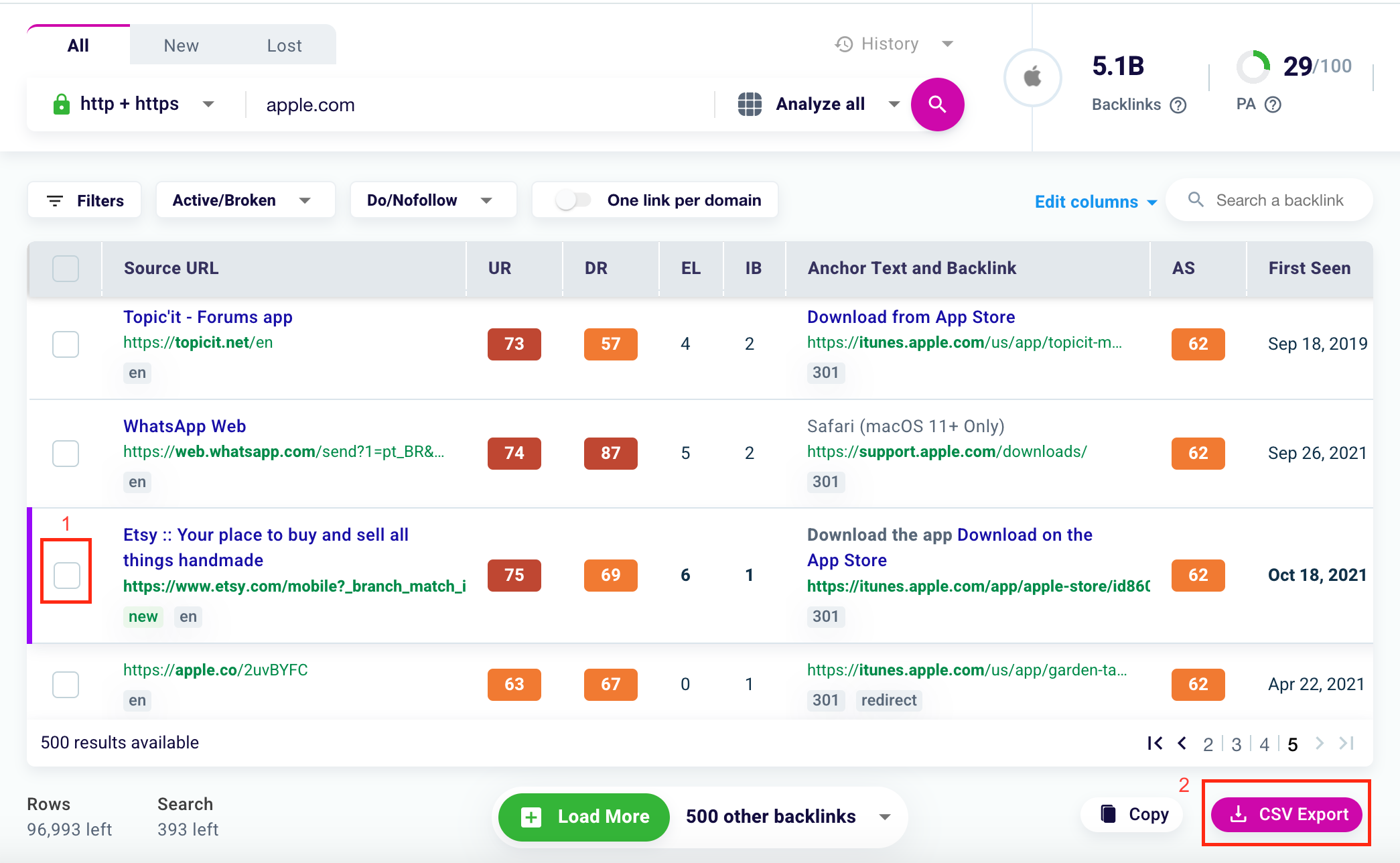 To export the results in CSV just select the backlinks of your preference, click the boxes to the left of the URL of origin column (1), and finally select the purple button “Export CSV” (2).