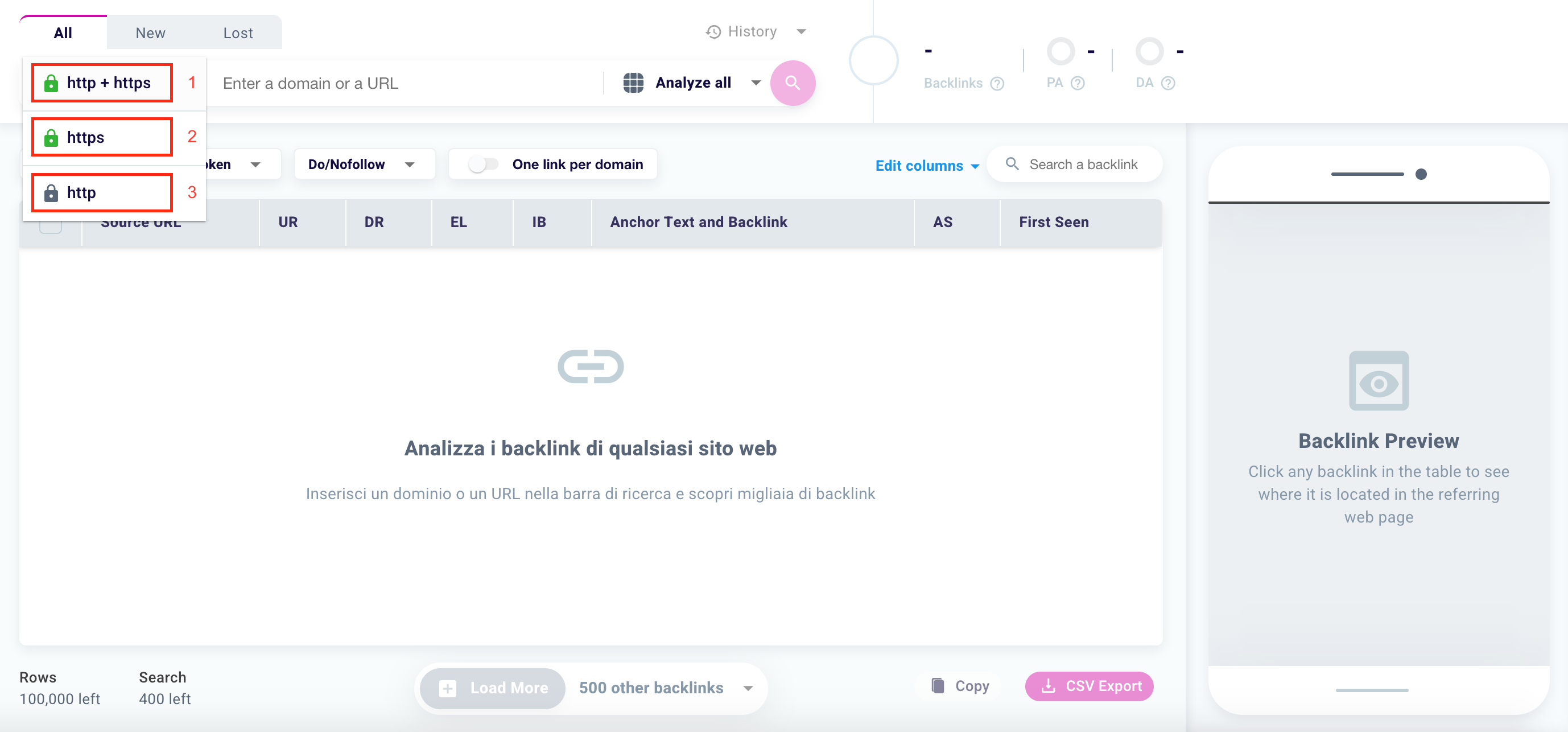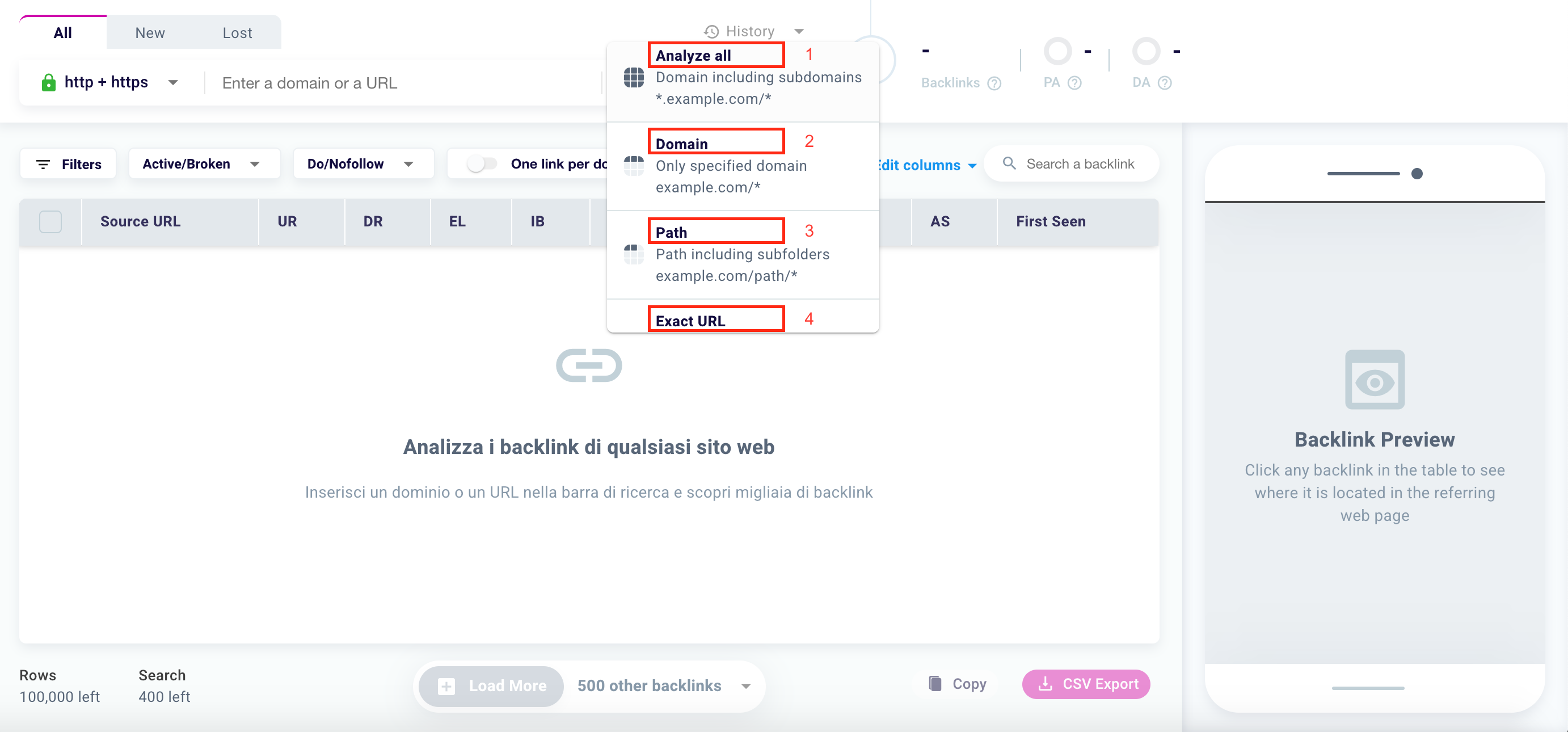 Do you want to choose how many backlinks are analyzed in addition to those downloaded in the first instance by our tool? Click the select highlighted on the screen.