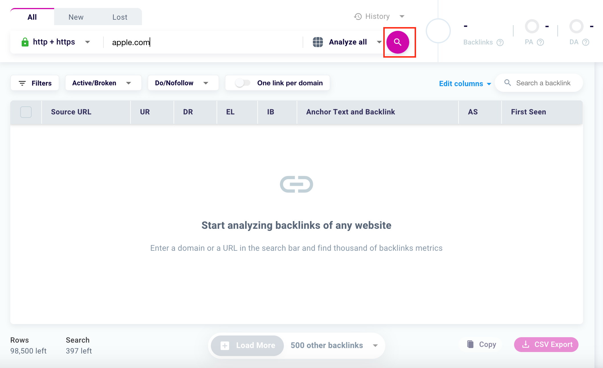 Finally, to start your backlink analysis, just click the magnifying glass to the right of the search bar.