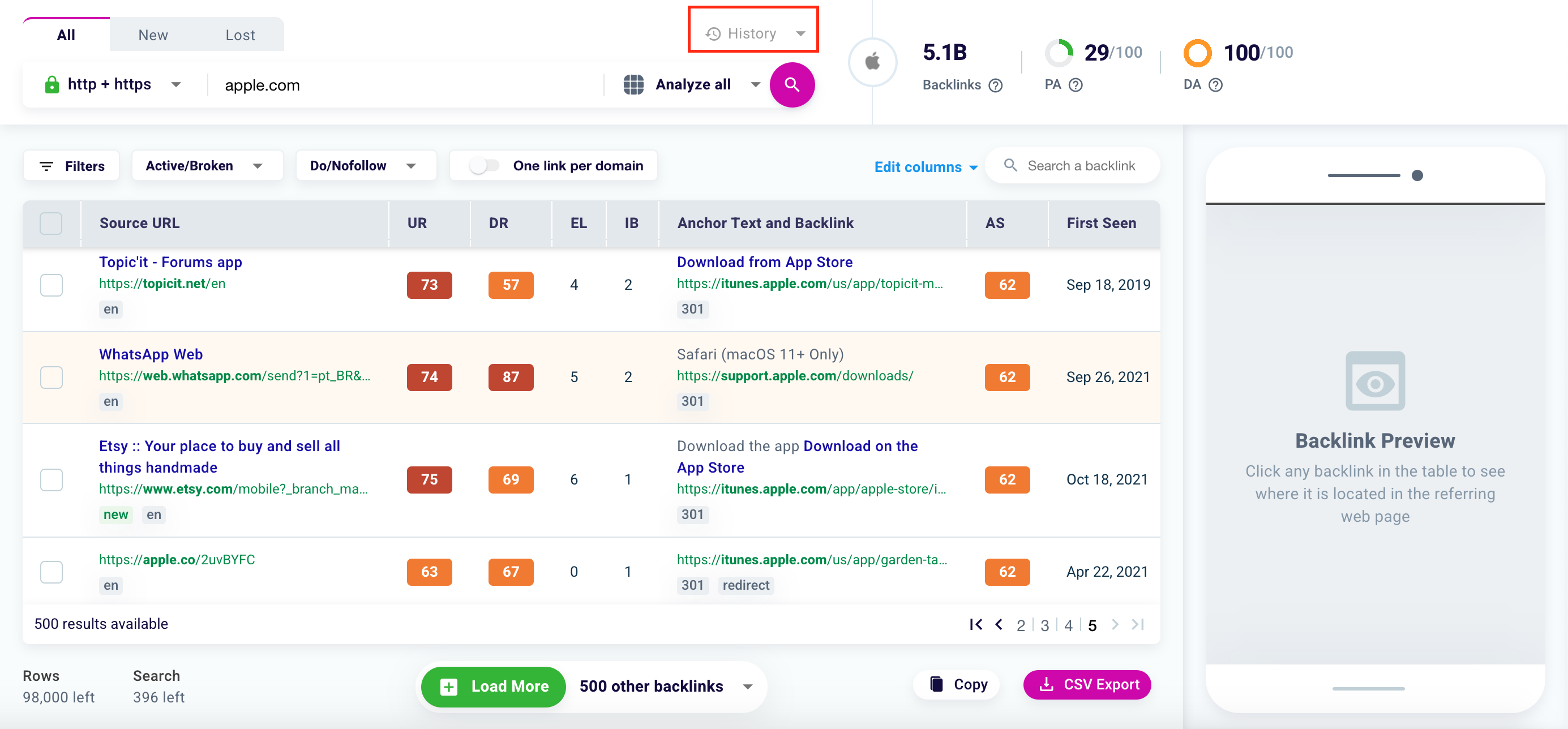 If you want to retrieve the checks made in the past on a specific backlink, just click the “History” button.