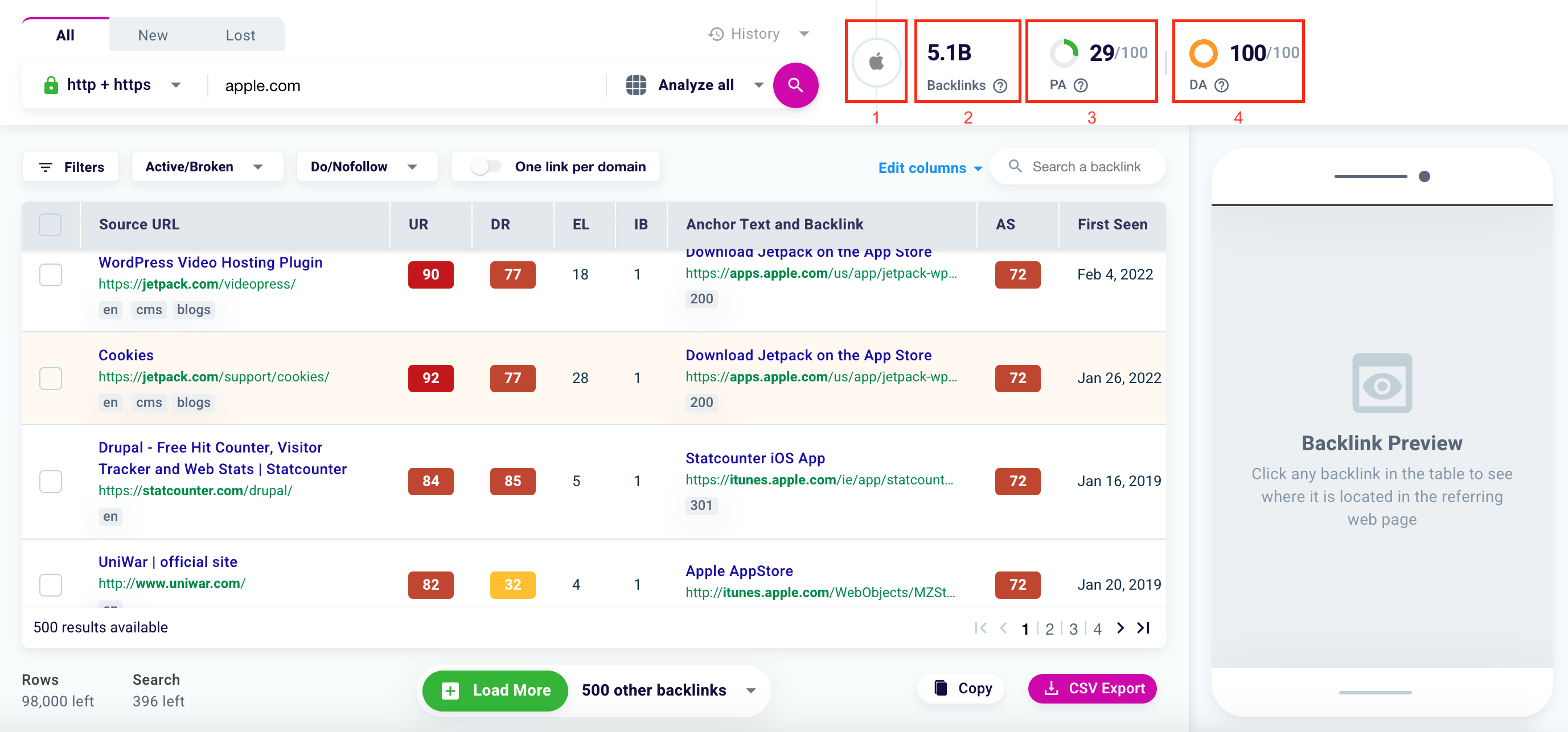 To the right of the search bar, for each domain or URL analyzed you will be able to view the favicon (1), the total number of backlinks found (2), the Page Authority (3), and the Domain Authority (4).